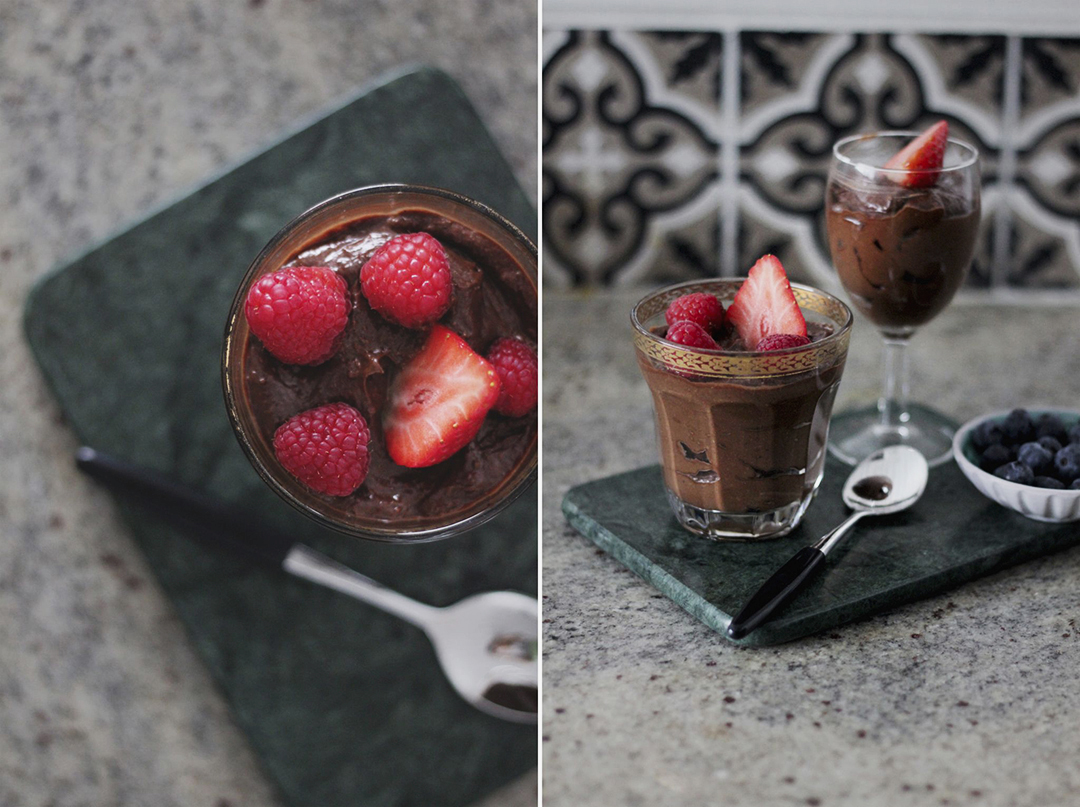 Cashewnötterna måste ha legat i blöt i ett par timmar före användning, helst över natten. Har du inte cashewnötter kan chokladkrämen också göras utan nötter, men det blir extra trevligt och krämigt med dem. Lägg alla ingredienserna i en bra mixer eller matberedare och kör tills det blir en helt slät och fin kräm. Om det behövs, justera konsistensen med lite vatten på vägen. Krydda med mer kakao när det behövs. Vill du ha den snäppet sötare kan du också vända i lite honung, möjligen alternativa sötningsmedel som stevia eller vad du önskar, men jag tycker att den är söt nog. Toppa med färska bär och gärna lite finhackad choklad och pistagenötter för extra lyx! NJUT! (Med mycket gott samvete!)