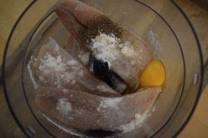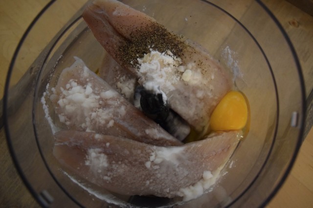 - Lägg fisk (det är mycket viktigt att den är kall, annars kan färsen spricka) och salt i en matberedare och kör till en slät färs. För att undvika att det blir för varmt kan du lägga i några isbitar.