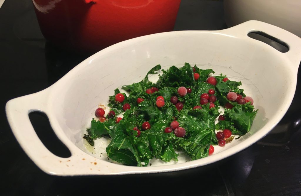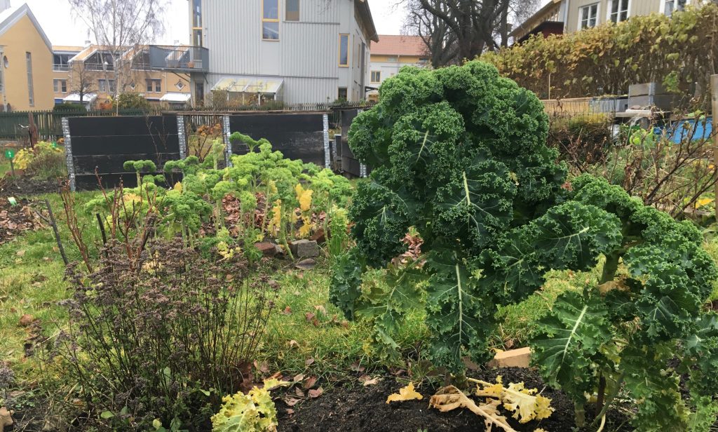 På några platser på jorden blir människorna extra gamla, många blir hundra år eller mer. De blir inte bara gamla, de håller sig friska – de har ingen eller mycket lite diabetes, få har hjärt-kärlsjukdomar eller alzheimer. Platserna kallas ”blå zoner” och många forskare har försökt hitta hemligheten bakom deras liv och hälsa. De blå zonerna ligger på vitt skilda platser på jorden – Okinawa i Japan, Nicoya i Costa Rica, byn Ogliastra på Sicilien, ön Ikaria i Grekland. Vissa räknar även in ett område i Kronobergs län i Småland bland de blå zonerna. Områdena kallas blå, bara för att de första forskarna ringade in områdena på kartan med en blå kulspetspenna, blåare än så är de inte. Så vad är hemligheten? Forskarna pekar på flera saker. Sammanhållning i familj och nätverk, känslan av mål och mening i livet. Jag slås av en del annat också: de blå zonerna är isolerade områden. Människorna är mycket utomhus. De bor i områden med berg och backar. De odlar sin egen mat, och äter även för övrigt lokalt producerad mat. Maten är olika, från plats till plats. Fisk och sjögräs i Okinawa, fläsk, lammkött och getost på Sicilien, gröna blad, örter och baljväxter på Ikaria, majs, ris och bönor på Nicoya. Och fläsk med löksås och stekt strömming i Småland. Så där är man ju inte mycket hjälpt, om man vill veta vad man ska äta för att hålla sig frisk och bli gammal. Men jag tänker närodlat. Det som växer här, där jag bor. Här växer inte ris och inte mycket majs. Ingen soja och ingen sötpotatis. Men likt människorna i Okinawa och Nicoya kan jag välja det som växer här, så lokalproducerat som möjligt, det finns i affären om inte annat. Men jag är också lycklig nog att ha ett trädgårdsland, en koloniträdgård. Hela sommaren har den gett mig lök och potatis och bönor, det sista som står kvar är grönkålen. Jag tar hem ett par blad till julbordet. Finhackar till vintersalladen med rödkål, vitkål och rödlök. Kanske lite äpple i också, som jag fått av grannen. Jag förväller det andra bladet så det blir lite mer medgörligt, kyler och torkar. Jag klipper till munsbitar, gnider in lite salt och olja, och sen bakar jag det i ugnen en stund, fem minuter sådär. Inte för länge, då blir det chips. Tar ut och strösslar med lingon från min systers skog. Gott till skinka eller lax eller vad man har.