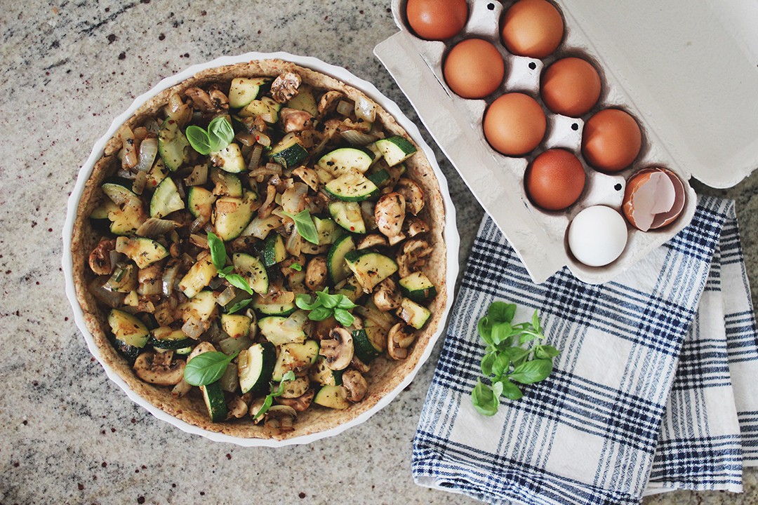 Finhacka lök, vitlök, squash och champinjoner. Stek grönsakerna gyllene i lite olivolja. Smaka av med salt och peppar. Fördela grönsakerna i pajskalet. Vispa ihop ägg och mascarpone (eller ev. annan ost) och häll massan i pajformen. Grädda pajen i 20–30 minuter vid 200 grader tills pajen är gyllenbrun och äggmassan har stelnat.