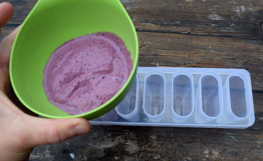 1. Eftersom röran är ganska flytande är det enkelt att få ner den i formarna med en tratt, men du kan lika gärna använda en sked. Konsistensen för glass blir alltid bäst i en glassmaskin, och har du en sådan bör du använda den. Men eftersom denna röra är ganska fryst från början, kan du även hälla den i glassformer. Konsistensen blir förhållandevis bra, även utan glassmaskin. Sätt in formarna i frysen.