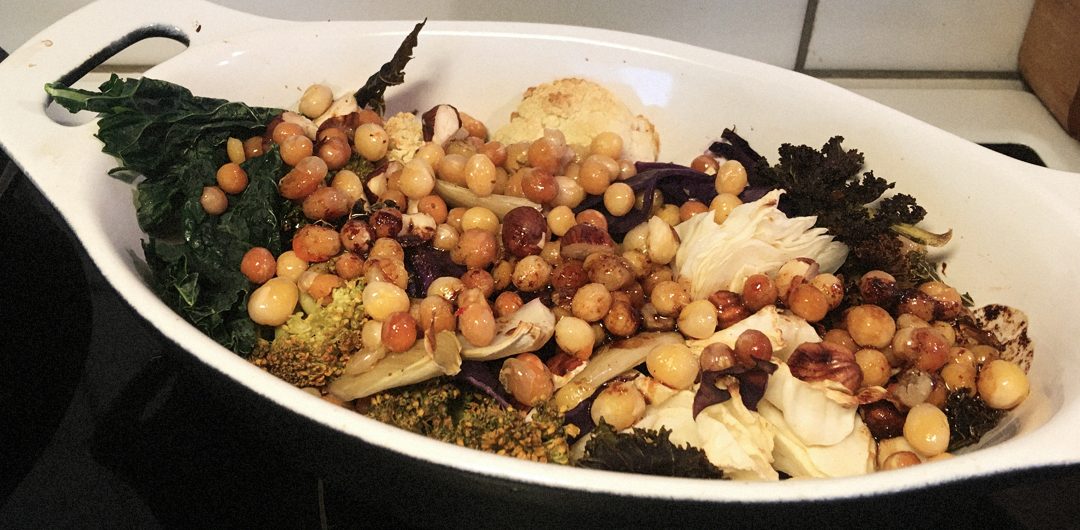 Skär alla kålsorterna lite grovt och i olika former. Ta bort den kraftiga mittnerven av grönkålen och riv bladen. Skär bort roten på fänkålen. Lägg alltihop i en lagom stor form. Rosta i ugnen tills bladen är helt torra och blomkålen och fänkålen fått lite färg, ca 20 minuter. Ta ut formen, blanda ner de gröna bladen och rör runt.