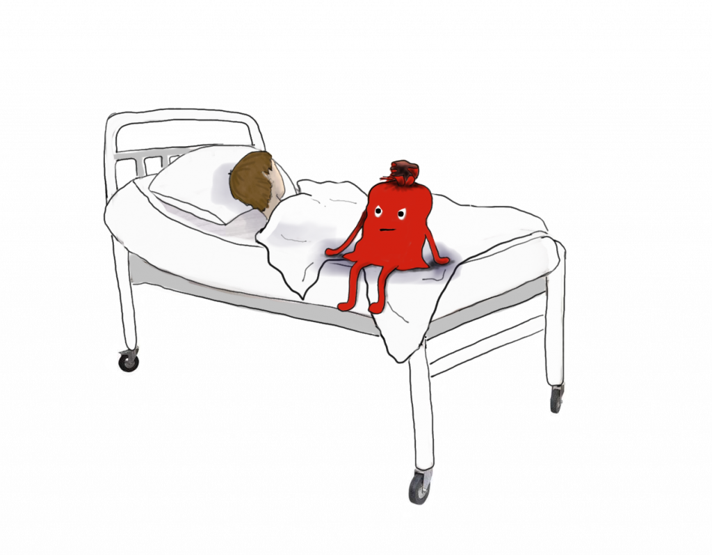 För första gången träffar Kim här den röda diabetessäcken, som flyttar in till honom för alltid. På sjukhuset. Det blir en kamp med tårar och frustration. Först när Kim inser, att det han måste samarbeta med sin objudne gäst blir livet lite enklare.
