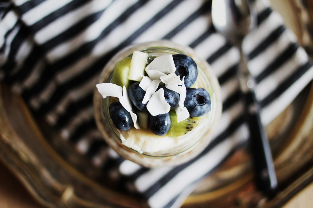 Bovete måste blötläggas i vatten minst en halvtimme före blandning med de andra ingredienserna. Täck boveten med vatten och låt den stå en stund. Häll av vattnet och blanda boveten med kryddor, mjölk och chiafrön i en lufttät behållare, gärna en burk. Förvara den i kylskåpet över natten. Nästa morgon blandar du gröten med 1 msk äppelmos, och toppar med massor av läckra frukter och bär.