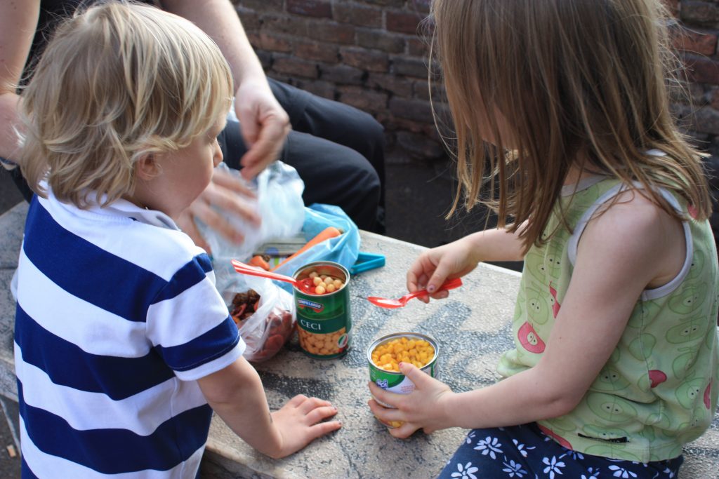 En annan detalj som skiljer oss från ”vanliga” familjer är mängden mat, snacks, mackor, frukt, druvsocker (massor) och antal paket flingor/müsli (nästan omöjligt att hitta vettiga utomlands) som vi har med oss. Vi vill inte vara beroende av att tågen kommer i tid, att kiosker har öppet, att vi hinner äta på planerade stopp. Hinner vi äta på planerade stopp så är allt väl, men om vi inte hinner eller om det inte finns mat som passar oss så klarar vi oss ändå. Det är en trygghet att veta det. Vår paradrätt när vi är på räls är kikärter, majs och oliver. De kan förvaras utan kyla och under lång tid, och är alltid redo att plockas fram vid behov. Våra barn är drillade att äta det sedan spädbarnstiden. Det är rentav lite festmat, för äter vi det vet vi att vi är ute på äventyr… Ja just det, morötter och en skalare har vi också alltid med oss. Bra när man behöver något att knapra på.