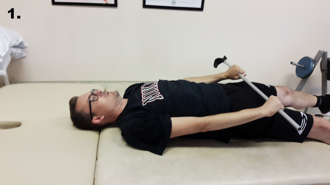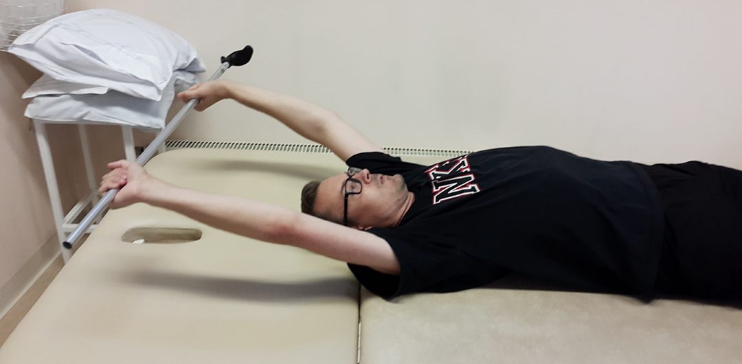 När det gäller stretch och träning så behövs endast en innebandyklubba eller liknande och ett gummiband som sjukgymnastiken kan hjälpa till med. Då övningarna kan skilja sig från olika typer av stelhet blir stretchövningarna individuella. Jag har valt att visa de vanligaste. Man kan med fördel göra övningarna även om man inte har fruden skuldra i förebyggande syfte.