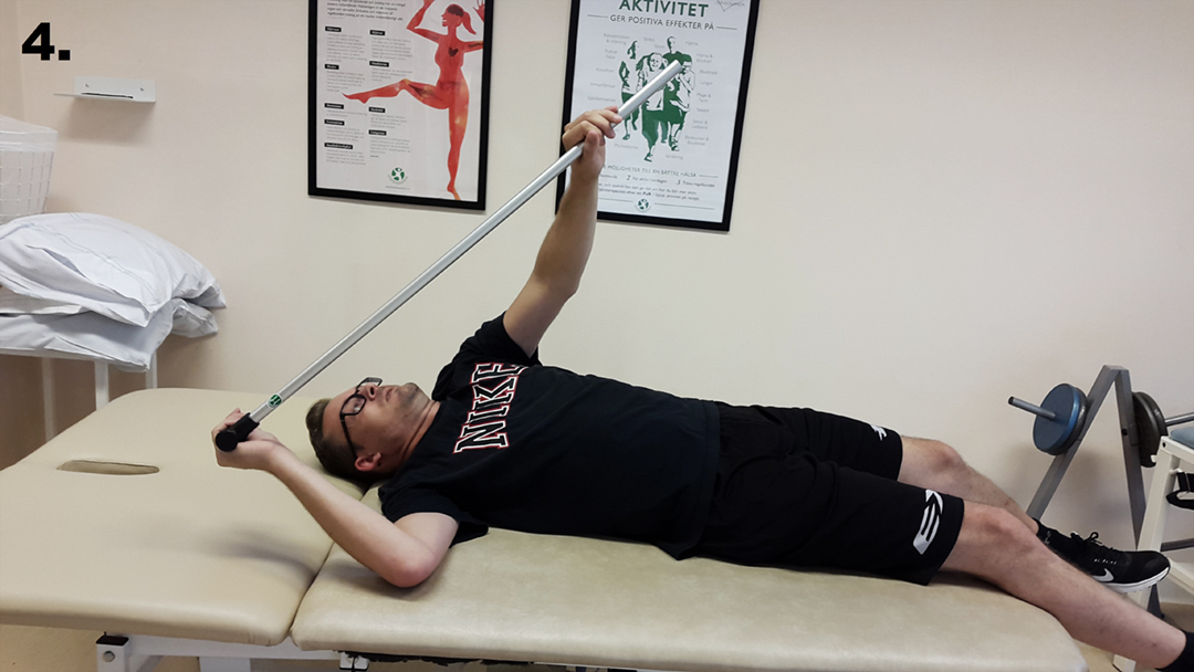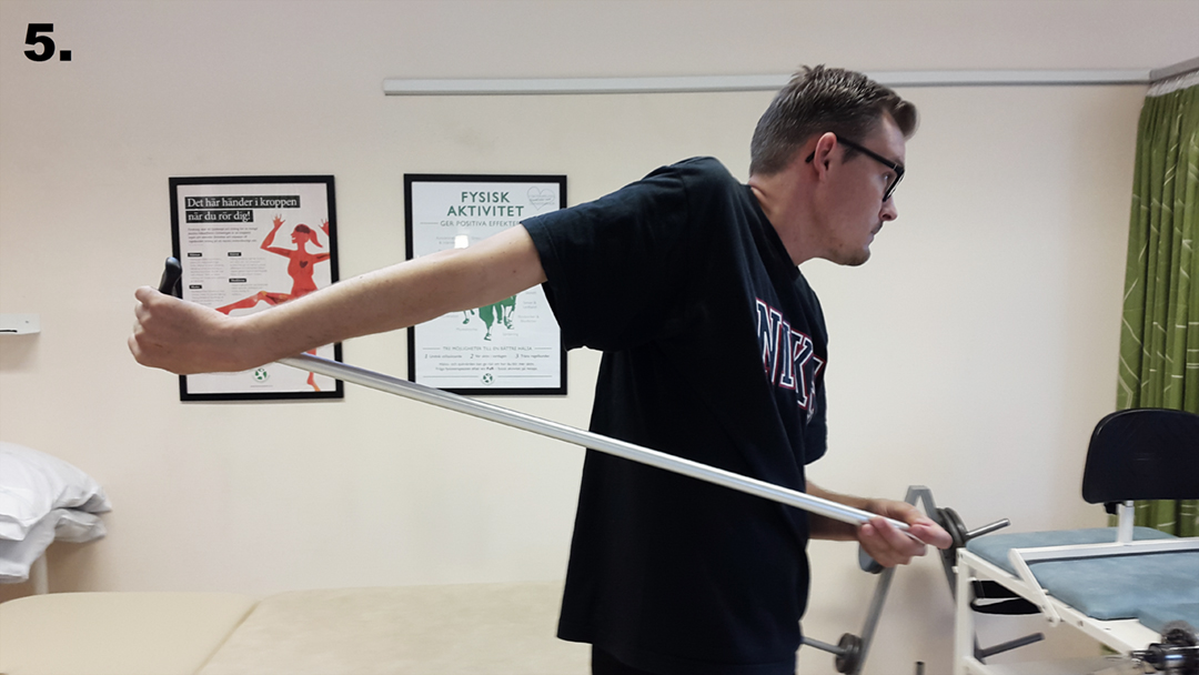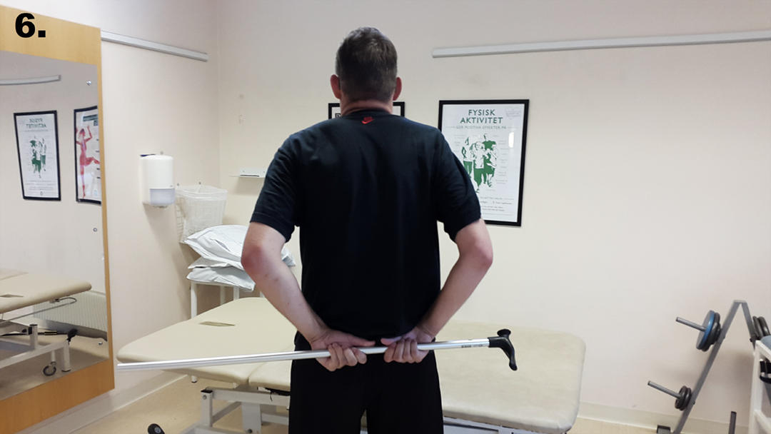 5Vid bakårrotation pressas rak arm bakåt till smärtpunkt nås. Även här upprepas övningen som ovan.