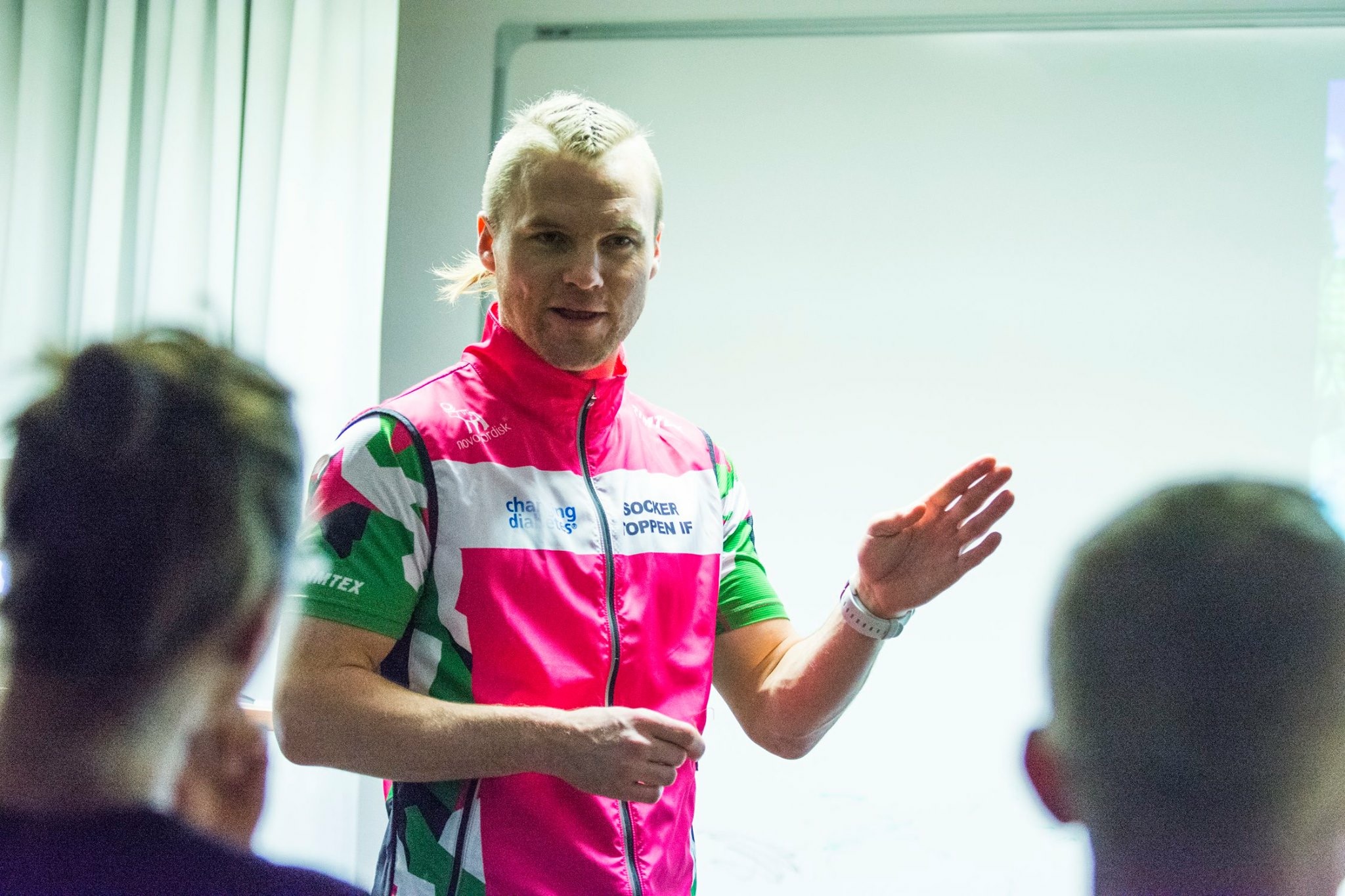 Själva helgen startade med rejäl energikick då Robin föreläste och vi fick vår utrustning. Tävlingsdräkt, överdragskläder samt mössa från Trimtex, Sockertoppen IF handskar från Lillsport och egendesign på OS-glasögon från Blizz samt ryggsäck från Salming. Vi syns bra! Vi tävlar för Sockertoppen IF, som är den förening Robin och Frida startat med mål att sprida glädje, kunskap om diabetes och visa att ingenting är omöjligt trots sjukdomen. Skillnaden mellan lägret Sokertoppen och föreningen är alltså att du inte behöver ha diabetes för att vara med i Sockertoppen IF. Alla är välkomna och alla kan stötta Sockertoppen lägren genom att köpa Sockertoppen kläder och accessoarer.
